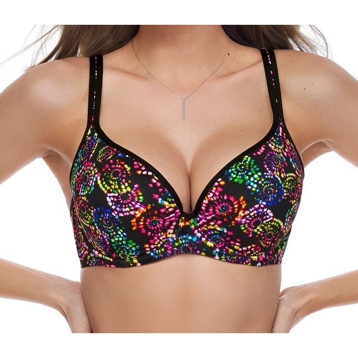 Dámská plavková podprsenka Casia P2801 je pevně vyztužený horní díl s kosticemi, který krásně tvaruje dekolt, poskytuje spolehlivou oporu i ve větších velikostech a díky nižšímu středu vytváří ženský, otevřenější výstřih. Má nastavitelná ramínka, pohodlný obvod se zapínáním na háček a je vyrobená z rychleschnoucího, elastického materiálu v pestrém vzoru doplněném černým lemováním, typickým pro elegantní českou kolekci Casia.