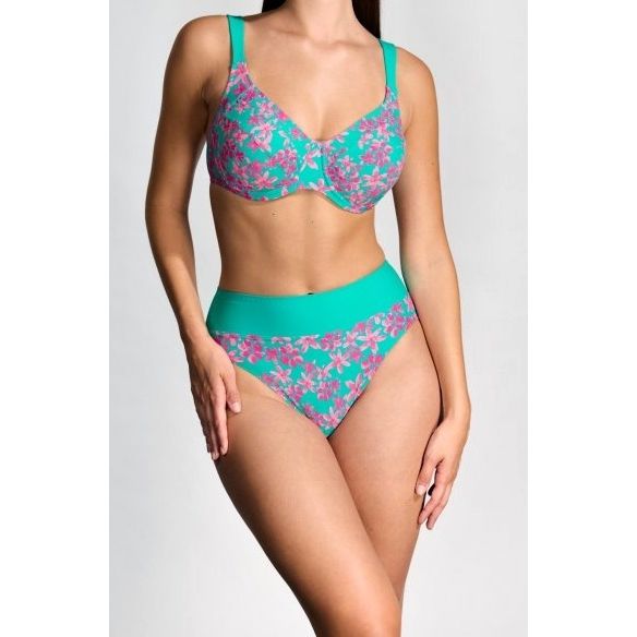 Dvoudílné plavky Timo jsou oblíbený model pro ženy s plnějším poprsím – mají pevnou nevyztuženou podprsenku s kosticemi, vyšším středem a širokým, tylem podloženým obvodem, který poskytuje výbornou oporu a stabilitu, zatímco nastavitelná ramínka zajišťují pohodlné nošení. Součástí setu jsou vysoké kalhotky s ohrnovacím lemem, které umožňují upravit výšku pasu podle potřeby, a celý model je ušitý z kvalitního rychleschnoucího materiálu (80 % polyamid, 20 % elastan).
