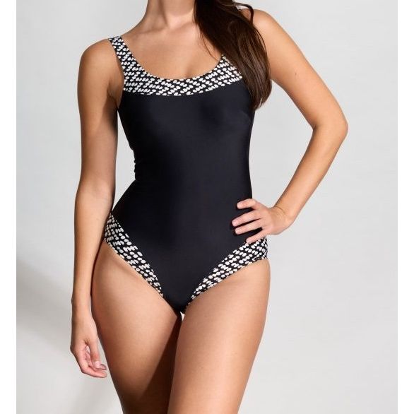 Dámské jednodílné plavky Timo nabízejí elegantní černý design s jemnými kontrastními panely, mají hladké moldované košíčky bez kostic se skrytou výztuží pro přirozený tvar a spolehlivou oporu, širší pohodlná ramínka, lichotivé zeštíhlující linie na bocích a příjemný pružný materiál, díky kterému krásně sedí a poskytují komfort při plavání i celodenním nošení.