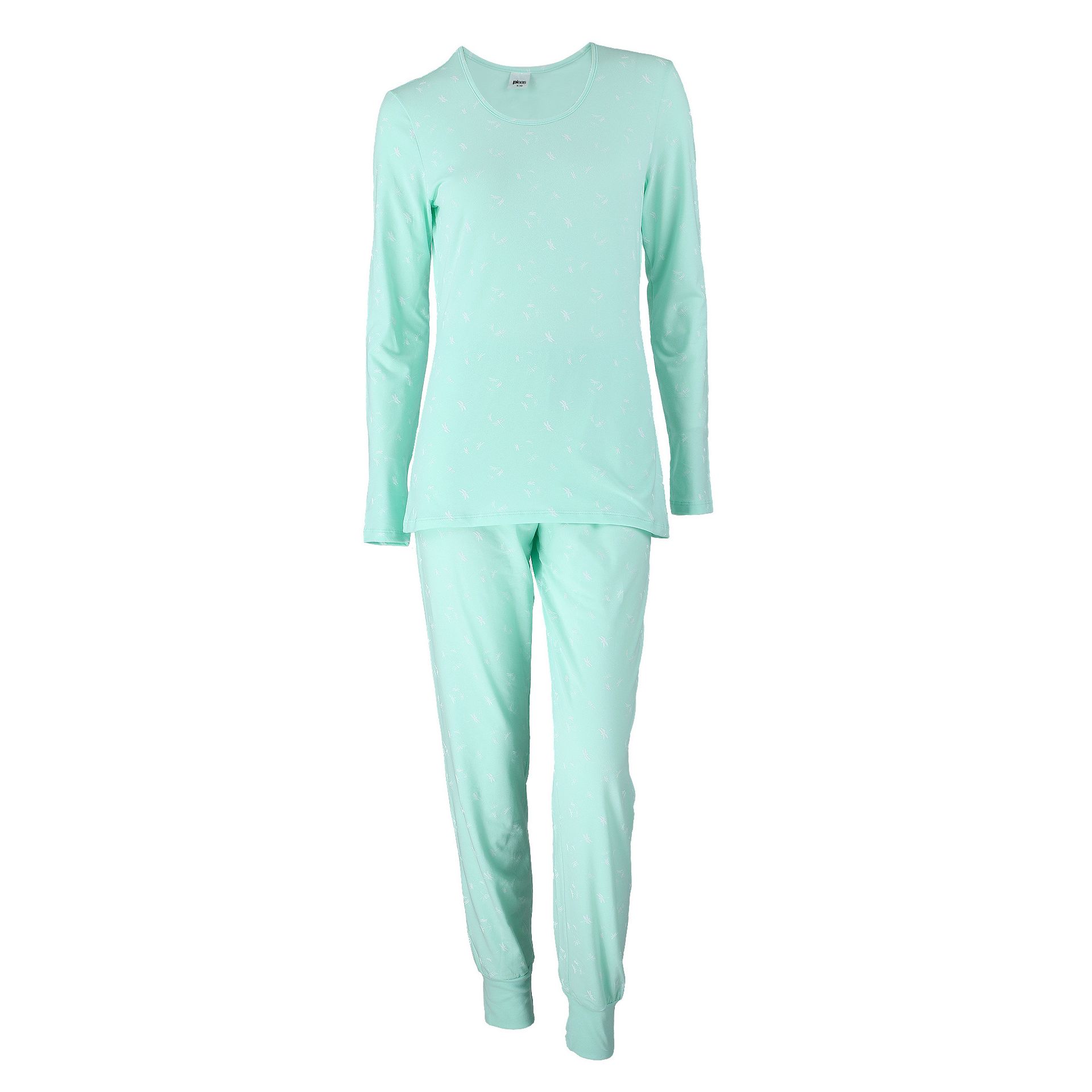Dámské pyžamo Pleas je dvoudílný komplet z kvalitní bavlny s příměsí elastanu, který zajišťuje pohodlí i pružnost při nošení. Horní díl tvoří tričko s dlouhým rukávem, kulatým výstřihem a decentním potiskem na přední straně, zatímco spodní díl představují dlouhé kalhoty zakončené náplety a elastickou gumou v pase pro perfektní padnutí. Pyžamo působí elegantně a útulně, je ideální na chladnější večery či zimní období a díky jemnému designu se hodí pro ženy, které preferují klasický střih s decentním zdobením.