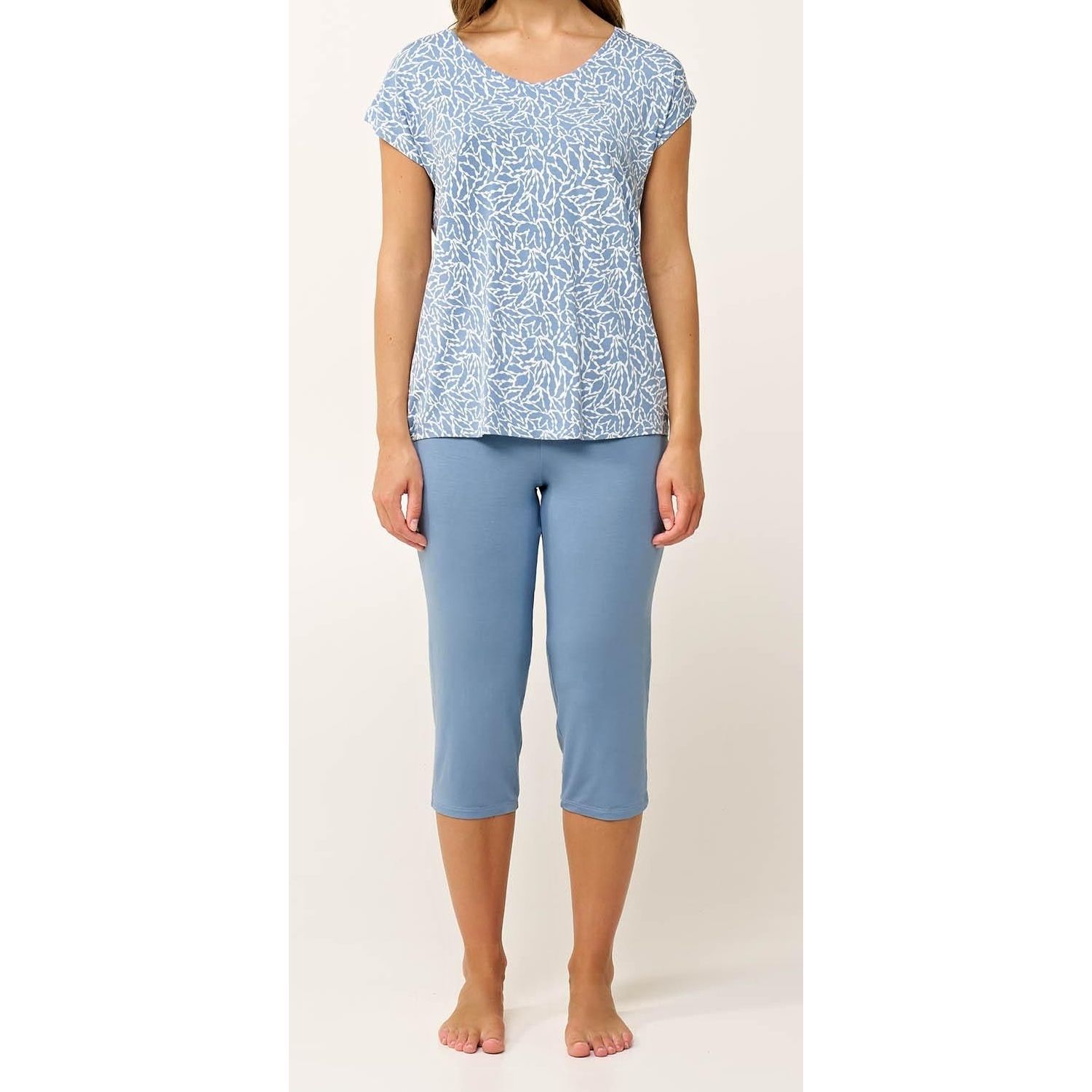 Dámské letní pyžamo Vamp z mimořádně hebkého a prodyšného mikromodalu (LENZING Tencel Modal Micro) s příměsí elastanu, které je známé svou chladivostí a splývavostí. Vrchní díl zdobí jemný modrobílý přírodní potisk, má krátké rukávy, kulatý výstřih a volnější střih bez zapínání, takže působí uvolněně a lichotí postavě. K tomu ladí jednobarevné kapri kalhoty v modrém odstínu s pohodlnou měkkou gumou v pase. Celý komplet je navržen tak, aby poskytoval maximální komfort, volnost pohybu a příjemný pocit i během horkých nocí. Materiál si dlouhodobě drží hebkost, pružnost i barvu, takže pyžamo zůstává krásné i po mnoha praních.