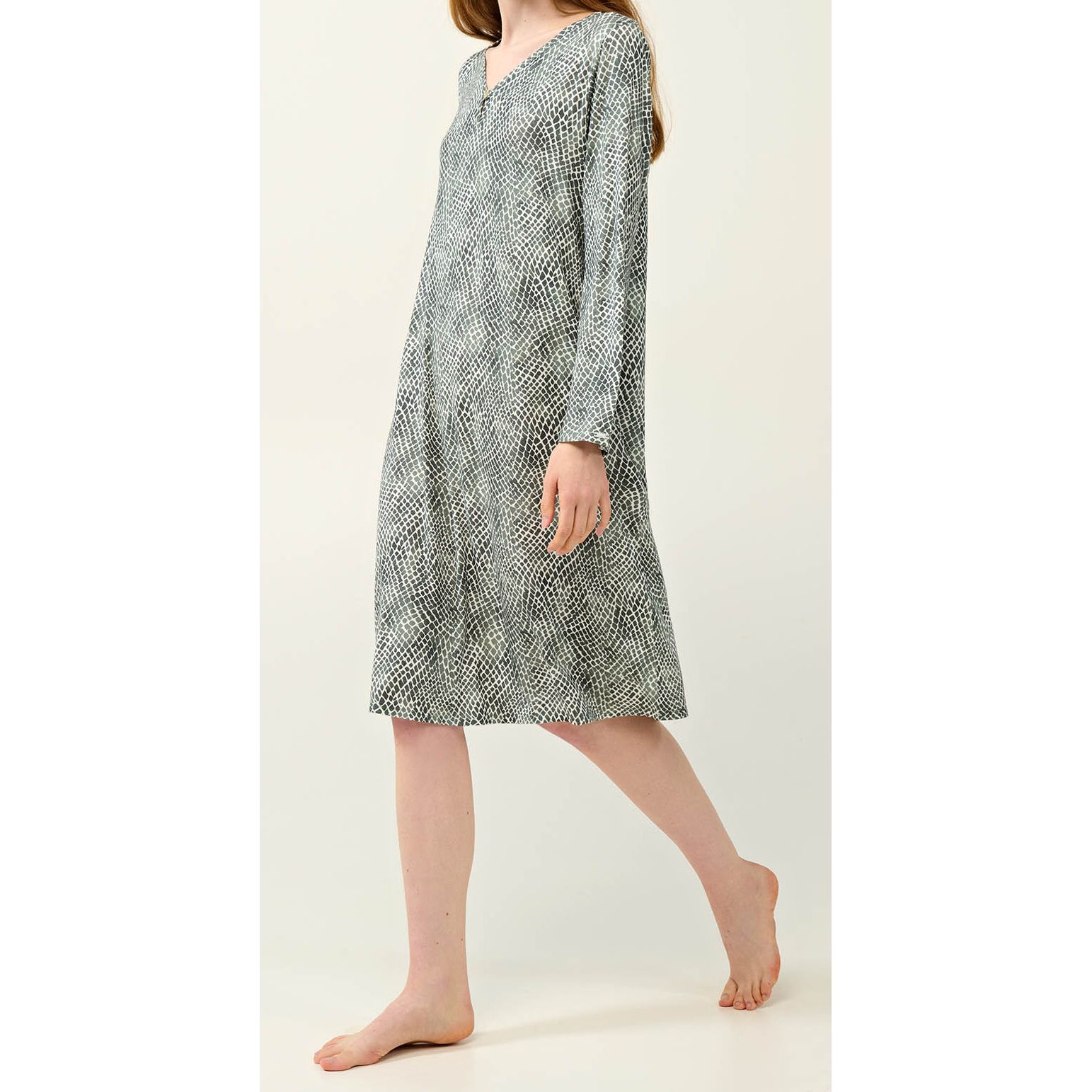 Dámská noční košile Vamp je elegantní a mimořádně příjemný model z luxusního materiálu LENZING Tencel Modal Micro (93 %) s 7 % elastanu, který krásně hladí pokožku a přirozeně se přizpůsobí postavě. Má dlouhé rukávy, jemnou knoflíčkovou légu u výstřihu a zdobí ji vkusný animal print, díky němuž působí moderně a nadčasově. S délkou 105 cm poskytuje pohodlí i volnost pohybu, takže je ideální pro klidný spánek i večerní domácí relax.