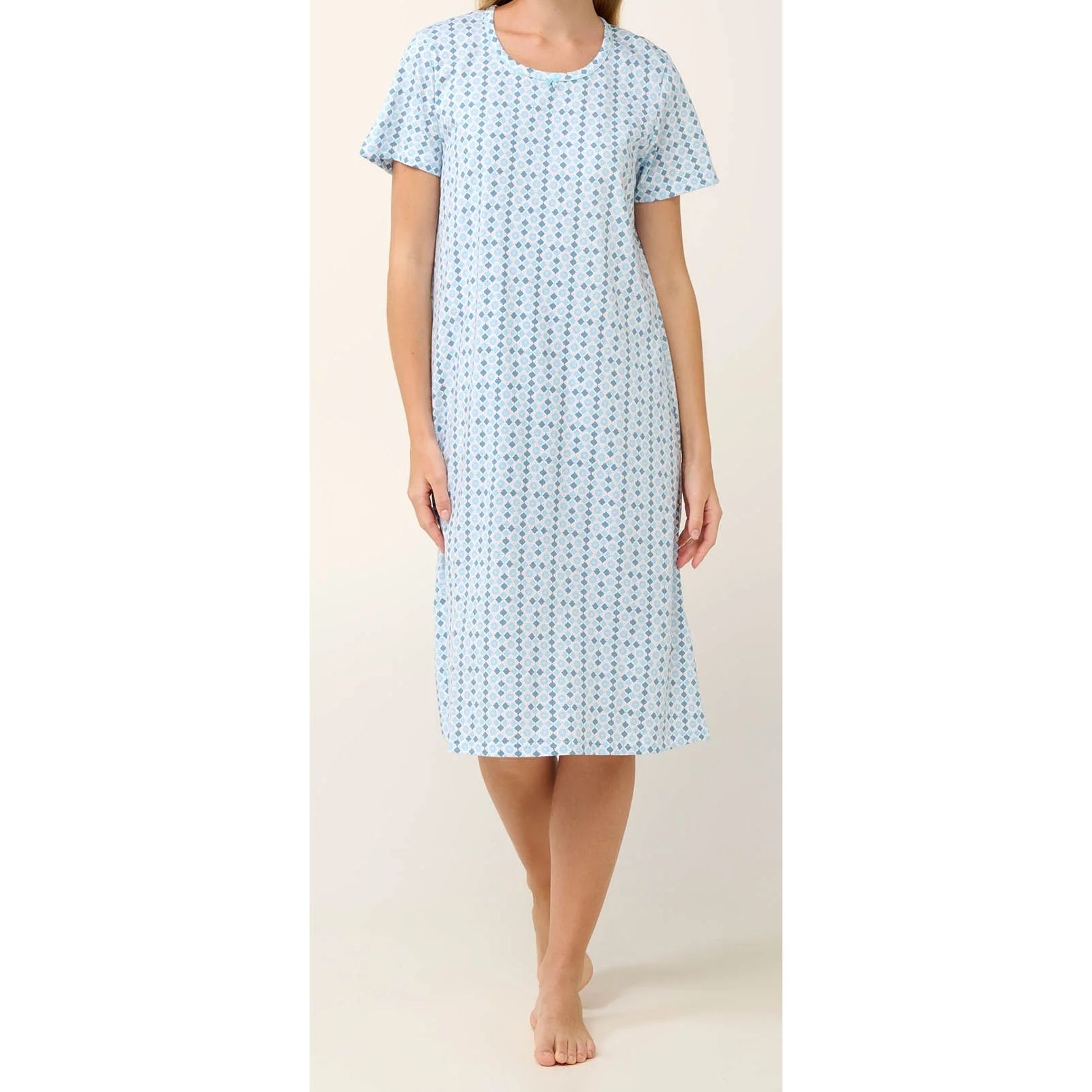 Košile má délku 110 cm, což zajišťuje komfortní zakrytí a volnost pohybu. Střih je rovný a pohodlný, navržený tak, aby lichotil postavě a zároveň poskytoval maximální komfort při spánku i domácím odpočinku. Model zdobí geometrický potisk, který dodává moderní a svěží vzhled, aniž by působil rušivě.