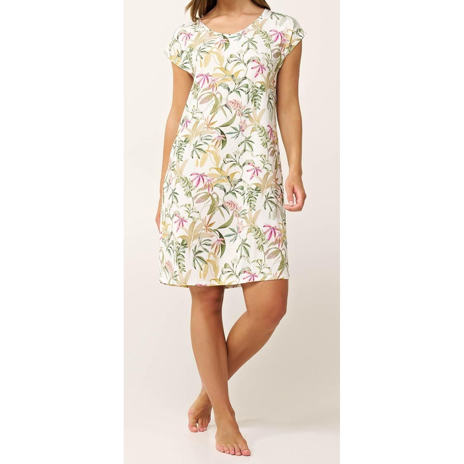 Dámská noční košile Vamp je lehká, mimořádně hebká a velmi příjemná košile z prémiového materiálu LENZING™ Tencel Modal Micro s příměsí elastanu, který zajišťuje měkkost, prodyšnost a krásné splývání na postavě. Má krátké rukávy a volnější pohodlný střih, který neomezuje v pohybu a poskytuje maximální komfort během spánku i domácího odpočinku. Košile je zdobená jemným botanickým potiskem, který působí elegantně, svěže a nadčasově. Délka sahá nad kolena, což dodává vzdušnost a praktičnost pro každodenní nošení. Díky lehké struktuře materiálu je ideální na teplejší období a nabízí pocit lehkosti po celou noc.