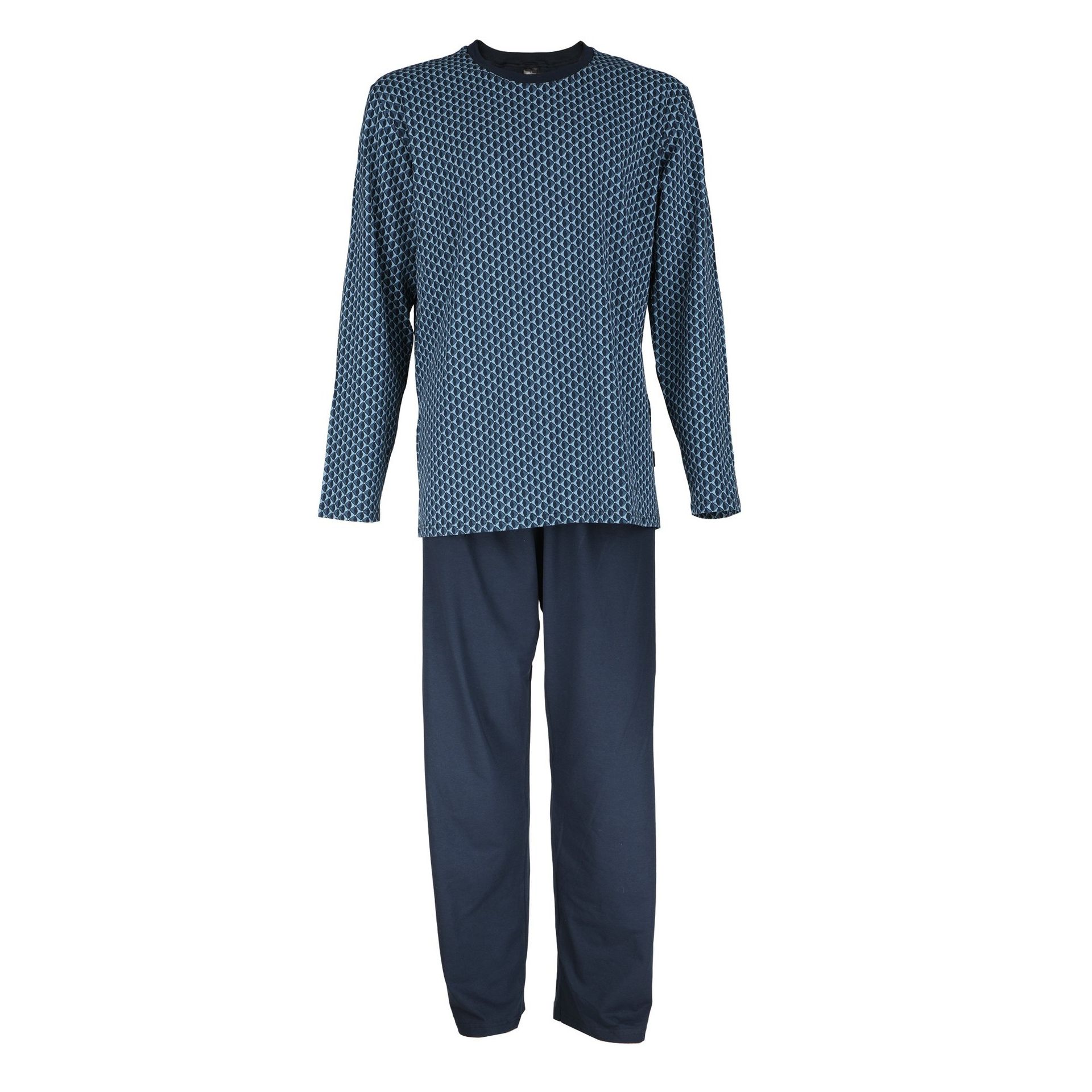Pánské dlouhé pyžamo Pleas kombinuje pohodlí a styl. Je vyrobené z příjemného úpletu s volnějším střihem, kulatým výstřihem a dlouhými nohavicemi bez nápletů, ale s elastickou gumou v pase. Vrstvení je elegantní. Horní díl v tmavě modré barvě s jemným geometrickým potiskem, spodní díl je jednobarevný tmavší tón pro univerzální vzhled. Díky měkkému, prodyšnému materiálu s mírnou pružností poskytuje svobodu pohybu, zachovává tvar po praní díky kontrastnímu lemu výstřihu. Doporučuje se prát obrácené naruby na šetrný program do 40 °C bez aviváže, sušit volně na vzduchu mimo přímé slunce.