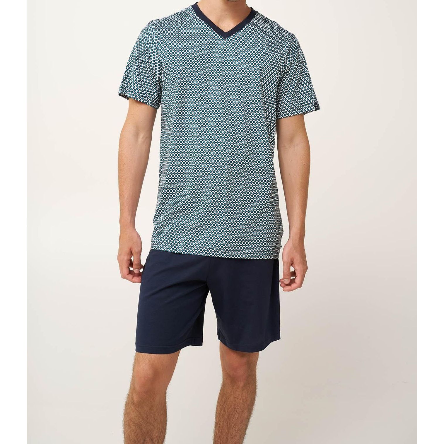 Pánské letní pyžamo Vamp je vyrobené ze 100% bavlny Single Jersey, která je měkká, lehká a prodyšná, takže je ideální pro teplé letní noci. Sada se skládá z trička se špičatým výstřihem a výrazným geometrickým vzorem v modrých tónech, doplněného o jednobarevné krátké šortky. Pyžamo je navrženo pro maximální pohodlí, volnost pohybu a příjemný pocit na pokožce, což z něj dělá perfektní volbu pro spánek i domácí relax.