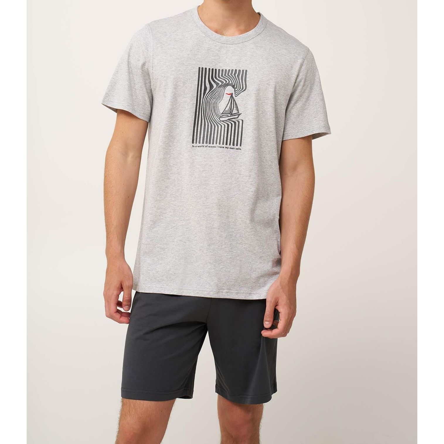 Pánské pyžamo Vamp je lehká letní souprava ze 100% bavlny single jersey, která zajišťuje měkkost, prodyšnost a pohodlí při spaní i domácím odpočinku. Vrchní díl má krátké rukávy, kulatý výstřih a zdobí jej hravý potisk lodí, zatímco krátké jednobarevné kalhoty nabízejí čistý a volný střih umožňující snadný pohyb. Celý komplet je navržen tak, aby udržoval příjemný pocit chladu během teplých dnů a večerů.